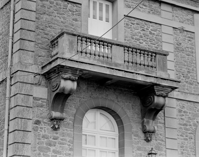 Vue de la façade antérieure sud, détail du balcon.Immatriculation