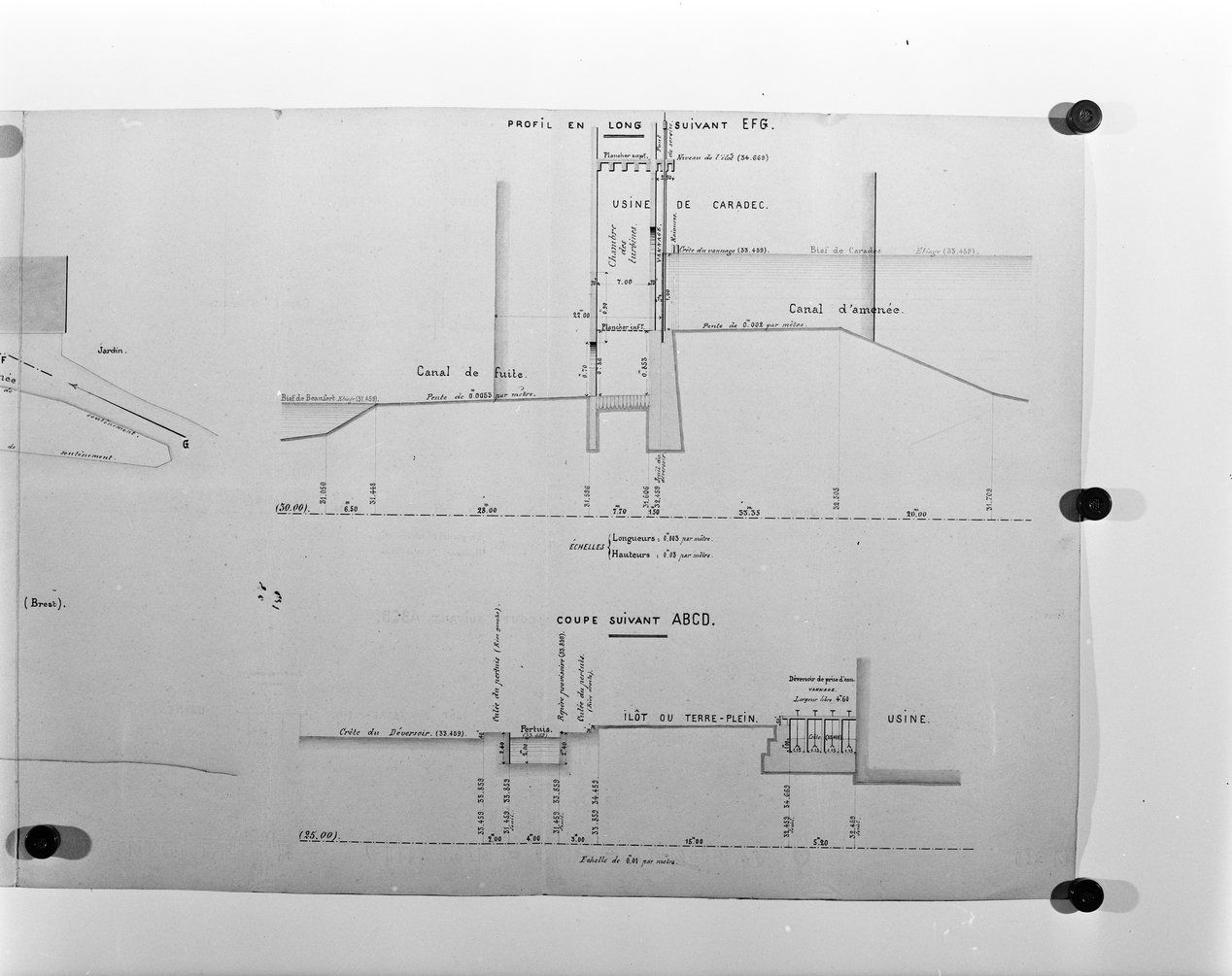[Usine de Caradec]. Plan général, profil en long suivant EFG et coupe suivant ABCD. Dessin, [1887]. Papier, encre, aquarelle.