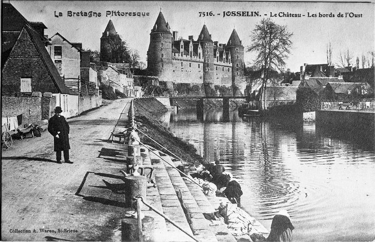 JOSSELIN. - Le Château - Les bords de l'Oust. Carte postale, Saint-Brieuc : Armand Warron, phot.-édit., [vers 1920].