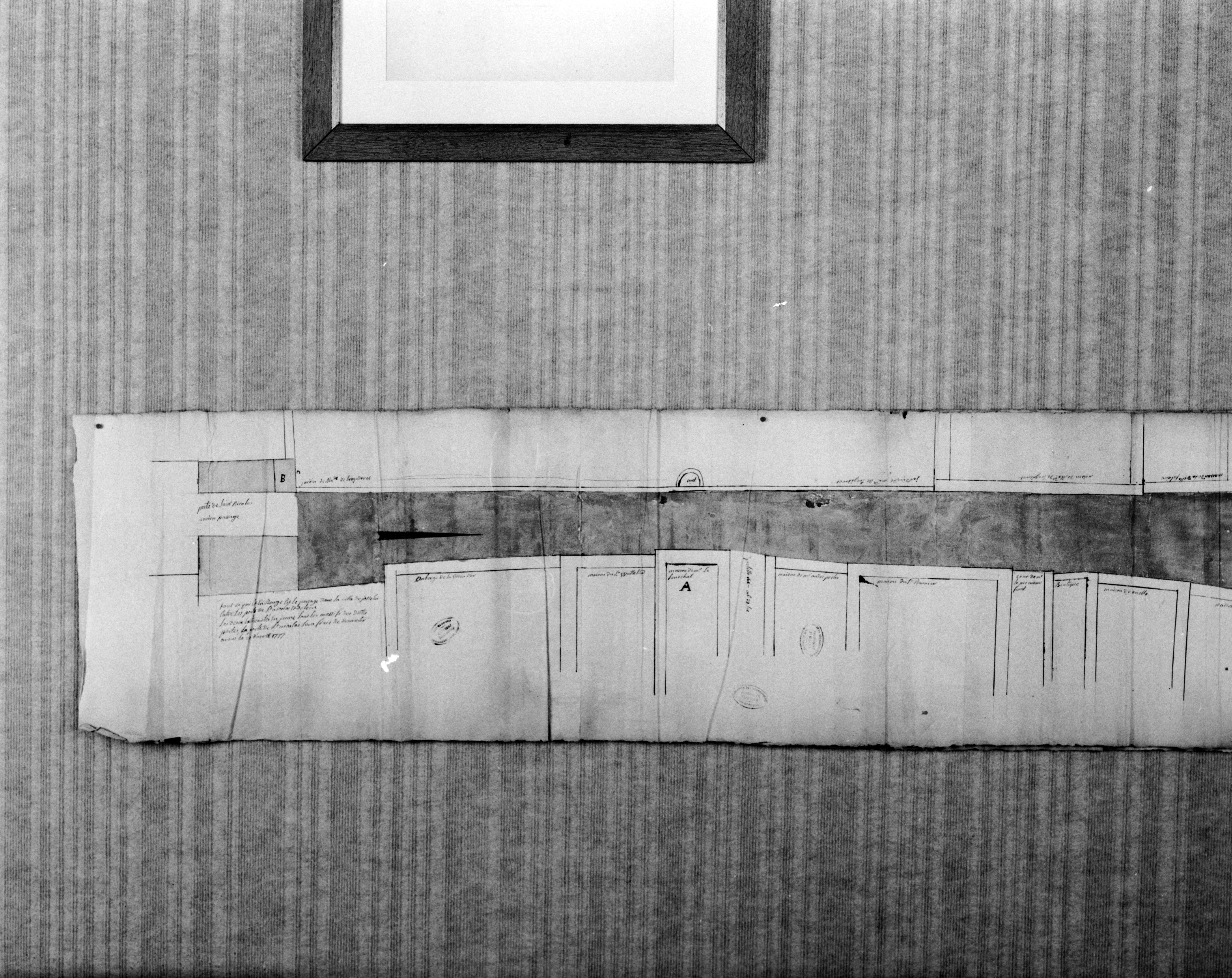A. D. Ille-et-Vilaine, C 729. Plan de la traversée de Josselin de la porte de Léon à celle de Saint-Nicolas. Dessin, par Monnier, 1777.