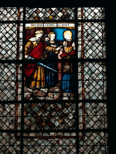 Ensemble de 3 verrière à personnages : sainte Barbe (baies 6, 8, 10) (La Ferrière fusionnée en Plémet en 2016),