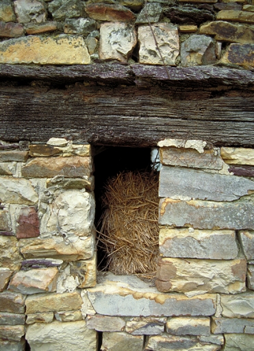 Détail : façade sud, jour avec linteau en bois et larmier de schisteImmatriculation