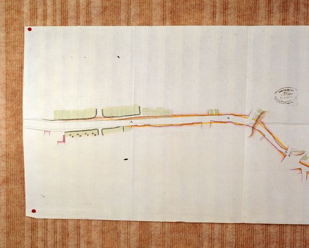 A. D. Ille-et-Vilaine. Série C 730/6. Plan de la traversée de la ville de Josselin servant aux routes de Pontivy, Locminé et Ploërmel, [..] pour élargir cette traversée et procurer au public un passage facile. Dessin, par Monnier, 22 mars 1779.