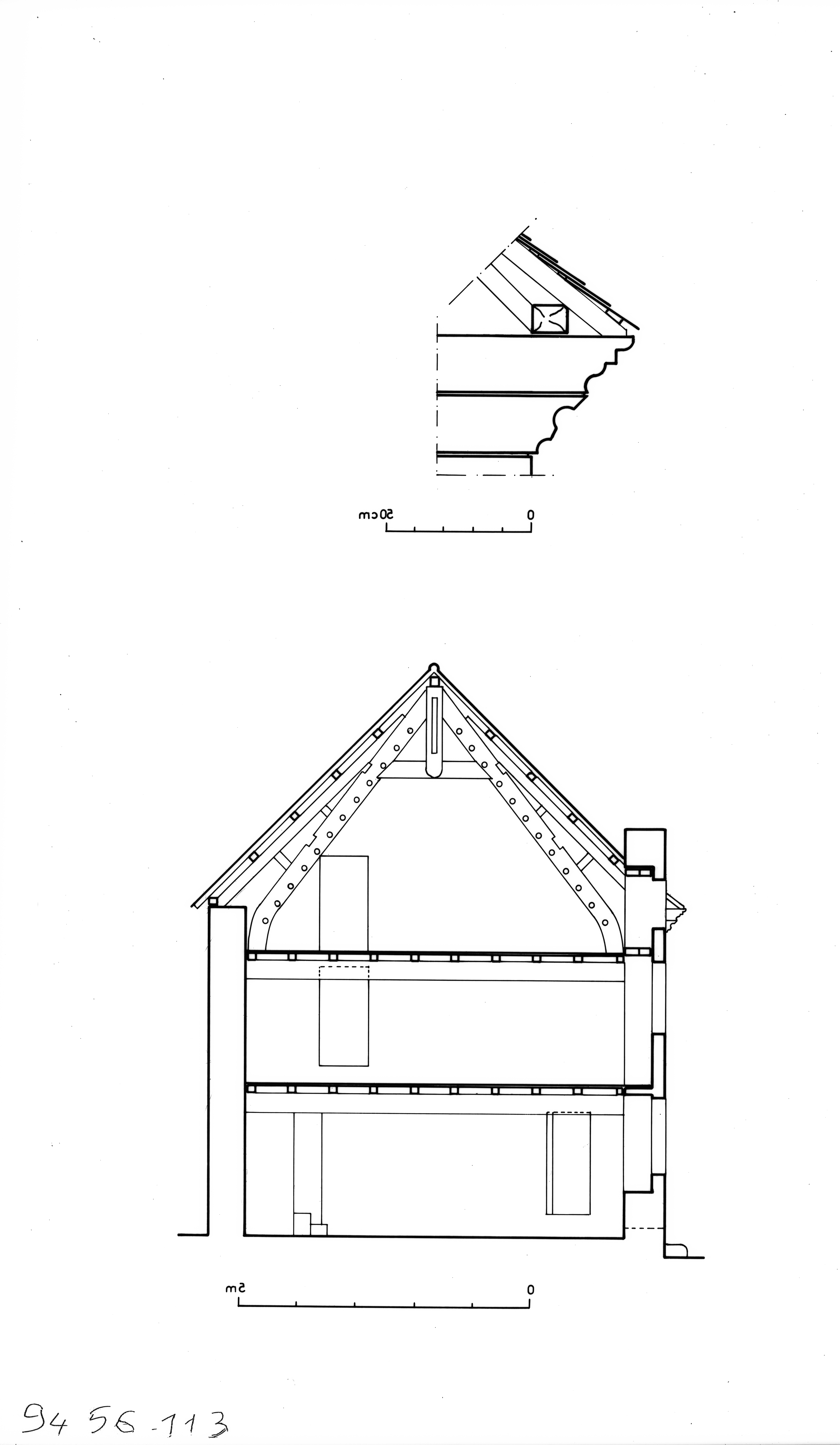 Maison : coupe transversale et profil de la corniche (état en 1994)Immatriculation