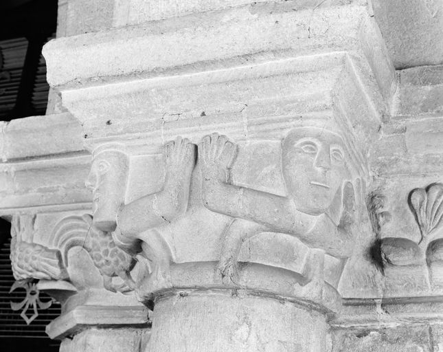 Angle choeur et chapelle nord, pilier est, décor du chapiteau (vers 1200) : deux hommes soutiennent la charge (état en 1994)Immatriculation
