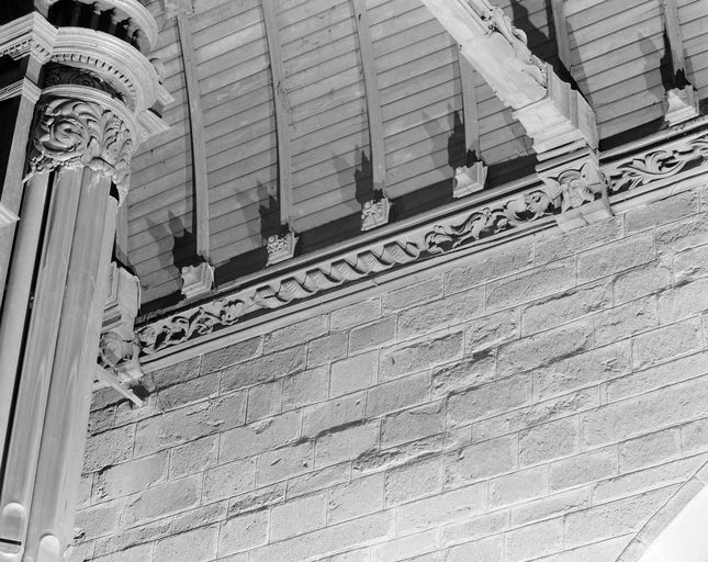 Église, sablière sculptée, partie 10 : deux hommes tiennent des branches feuillues ; au centre un phylactère portant une inscription latine (état en 1994)Immatriculation