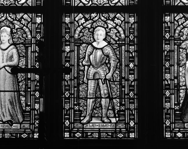 Verrière à personnages de la baie 0, registre inférieur, panneaux e1 et f1 : Anne de Rohan et Pierre de Rohan (état en 1994)Immatriculation