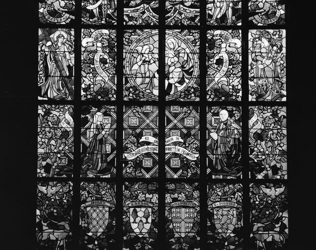 Verrière historiée de la baie 5, registres inférieurs : donateurs et Sainte Anne et la Vierge (état en 1994)Immatriculation