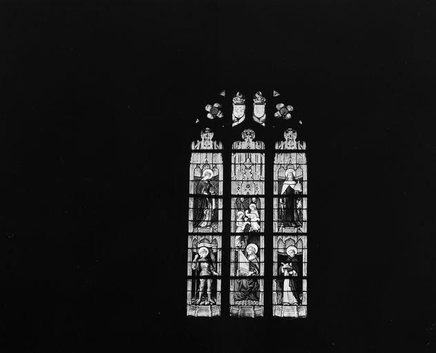 Verrière de la baie 12 : Sainte Françoise, sainte Jeanne, saint Hippolyte, sainte Cécile et saint Hervé (état en 1994)Immatriculation