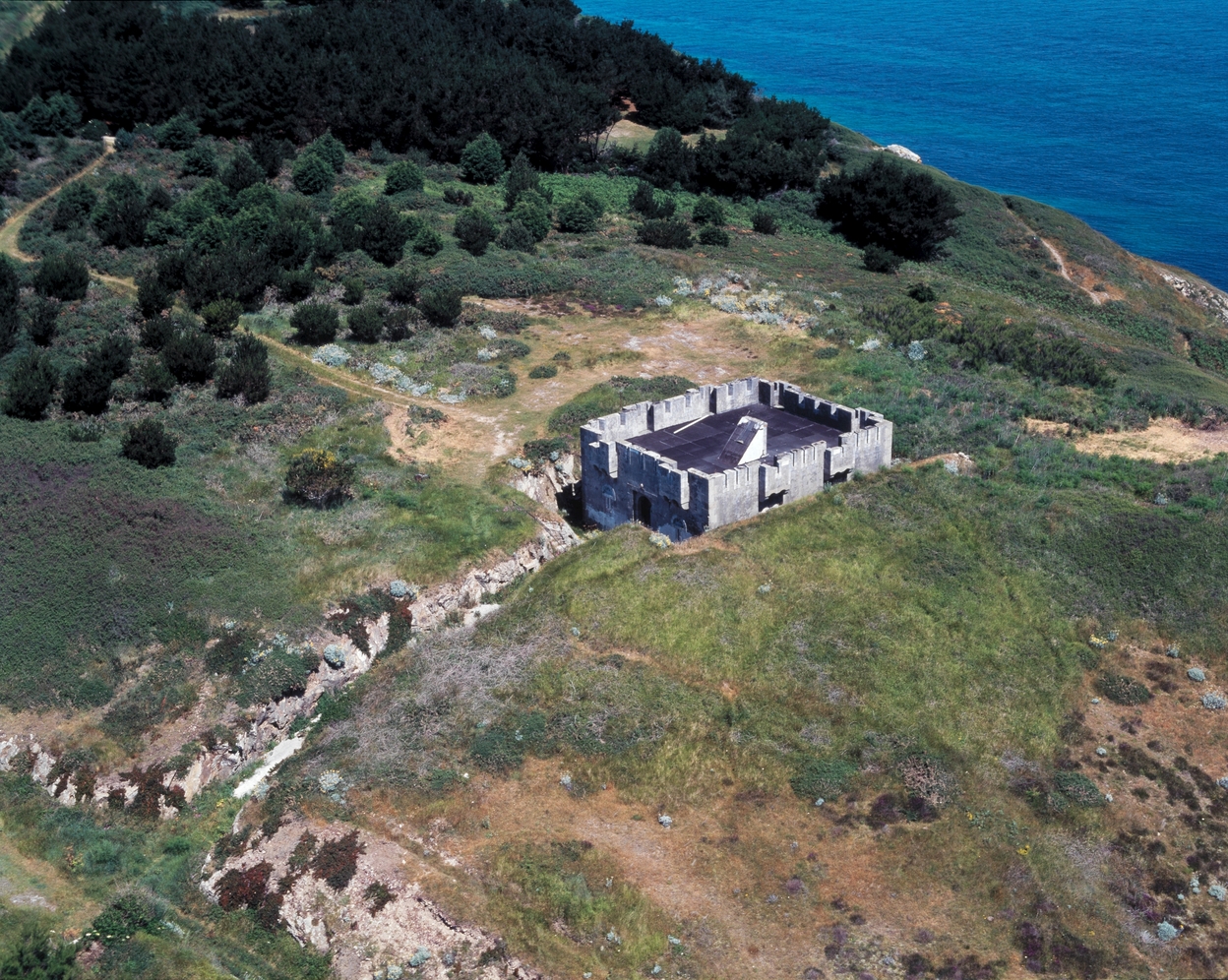 Locmaria, batterie de Kerdonis, corps de garde crénelé, vue aérienne.Immatriculation