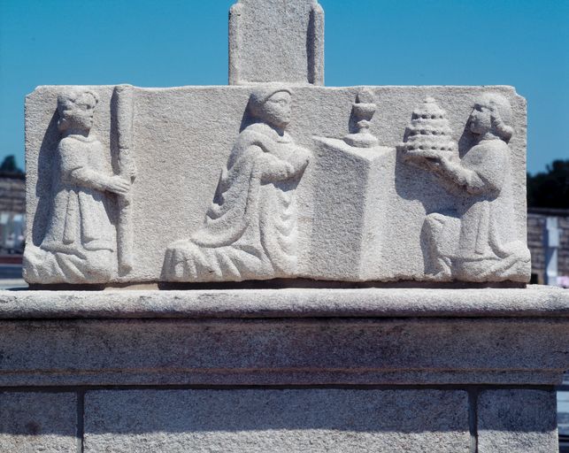 Croix de cimetière, socle vu de face : la Messe de saint GrégoireImmatriculation