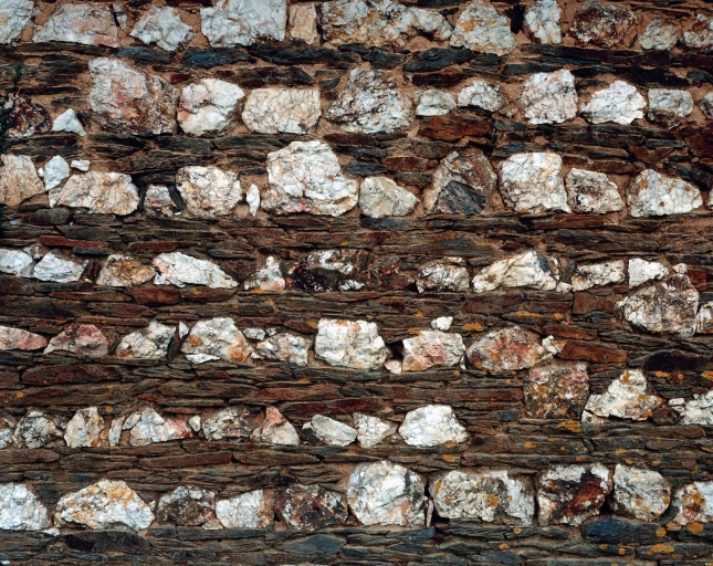Gas de Bois, ferme : grange, vue de détail de l'appareillage mixte : mur en plaques de schiste et moellons de quartz à assisses alternées.Immatriculation