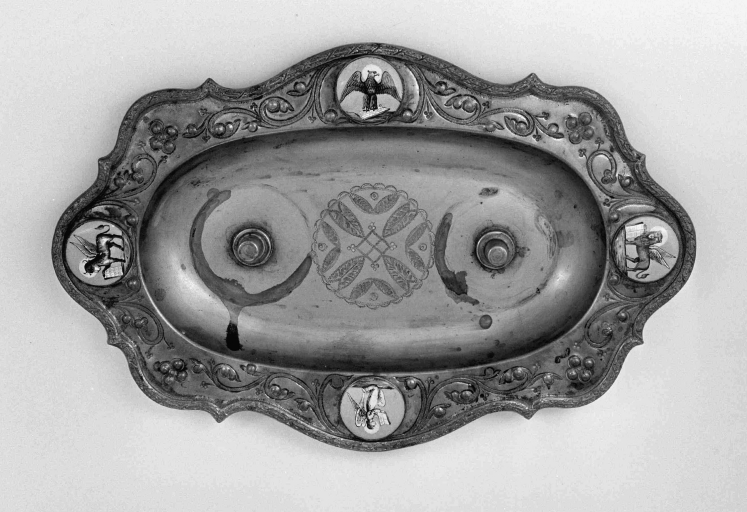 Chapelle : calice, patène, plateau à burettes, burettes, clochette d'autel,