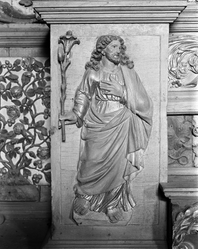 Socle gauche, détail : haut-relief représentant saint JosephImmatriculation