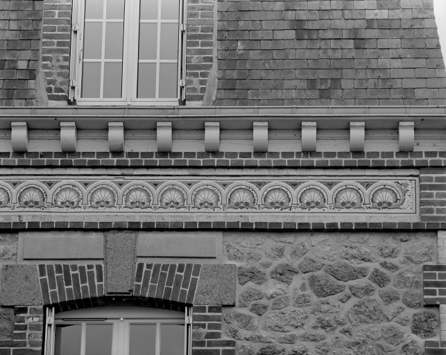 Elévation sud, détail de la frise de mosaïque.Immatriculation