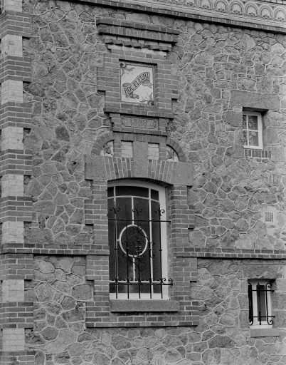 Elévation sud, détail des cartouches de mosaïque portant date et appellation de la villa.Immatriculation