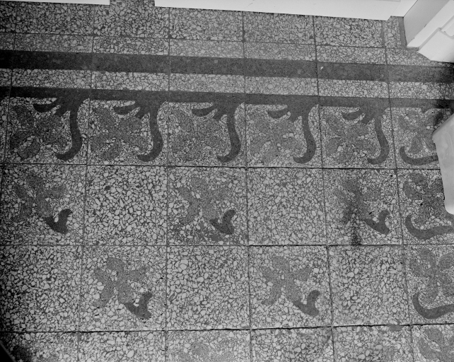 Hall d'entrée, détail du pavement en pâte de verre.Immatriculation