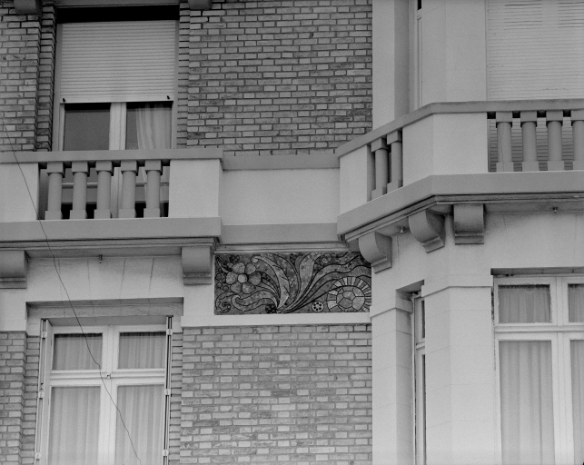 Elévation nord, détail de la frise.Immatriculation