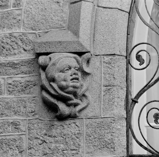 Elévation nord, détail de la sculpture tête d'homme en granit encadrant la baie en anse de panier.Immatriculation