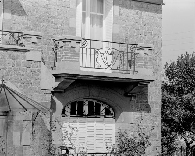 Elévation sud, détail de la ferronnerie du balcon de style art nouveau.Immatriculation