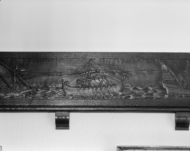 Détail de la frise en bois de chêne du salon et de la salle-à-manger représentant l'histoire de la marine.Immatriculation