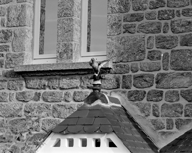 Détail de l'épi de faîtage sur l'auvent de la porte d'entrée de la maison située 22 rue de la Pionnière.Immatriculation