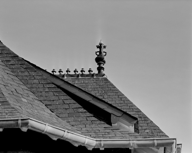 Détail de l'épi de faîtage sur l'auvent de la porte d'entrée de la maison située 22 rue de la Pionnière.Immatriculation