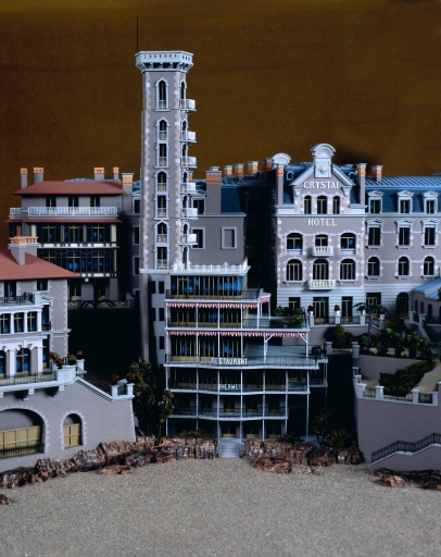 Crystal Hôtel vers 1920, vue rapprochée de la partie centrale de l'hôtel sur front de mer (maquette d'André Pompanon, Musée de Dinard).Immatriculation