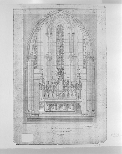Autel, gradin d'autel, tabernacle, exposition, statues (2) (maître-autel, tabernacle à ailes, tabernacle architecturé, figure d'ornement), style néo-gothique, église paroissiale Notre-Dame (Pocé-les-Bois),