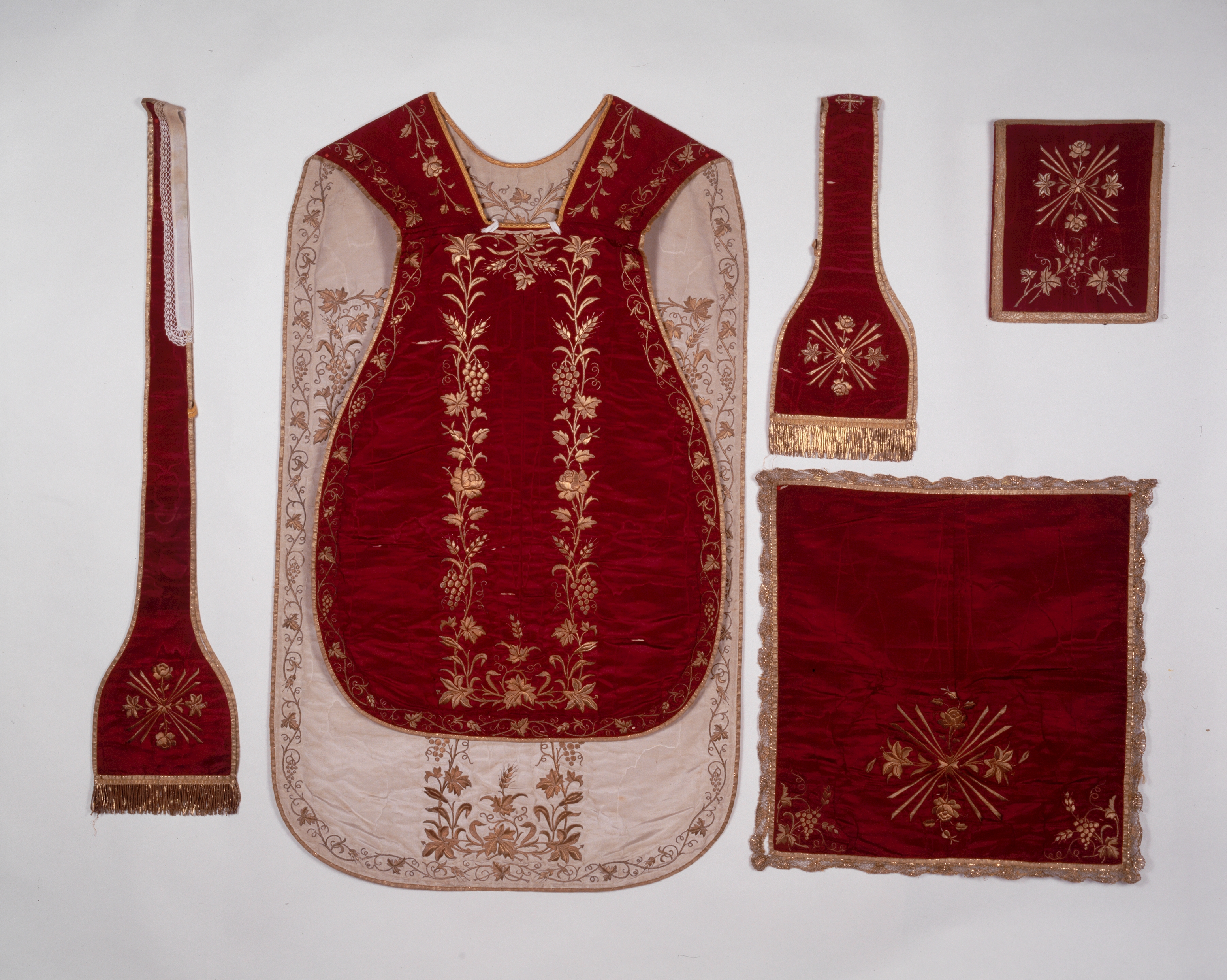 Ornement réversible blanc et rouge 2 : chasuble, bourse de corporal, étole, manipule, voile de calice, basilique Notre-Dame-du-Roncier (Josselin),