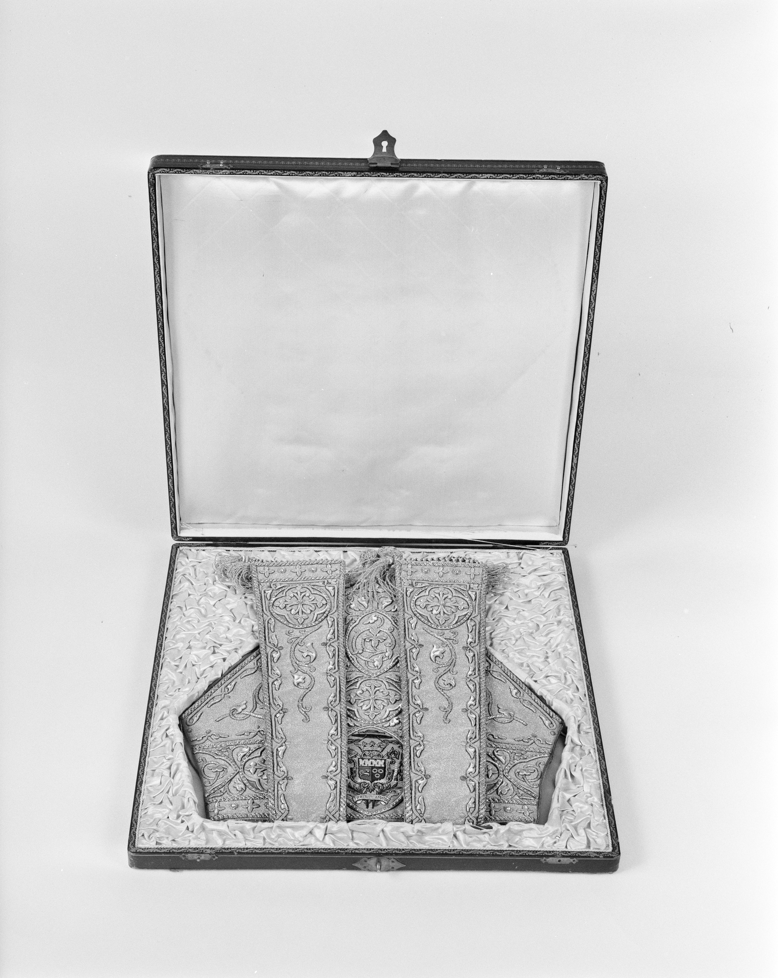 Mitre de Mgr Latieule et sa boîte, basilique Notre-Dame-du-Roncier (Josselin),