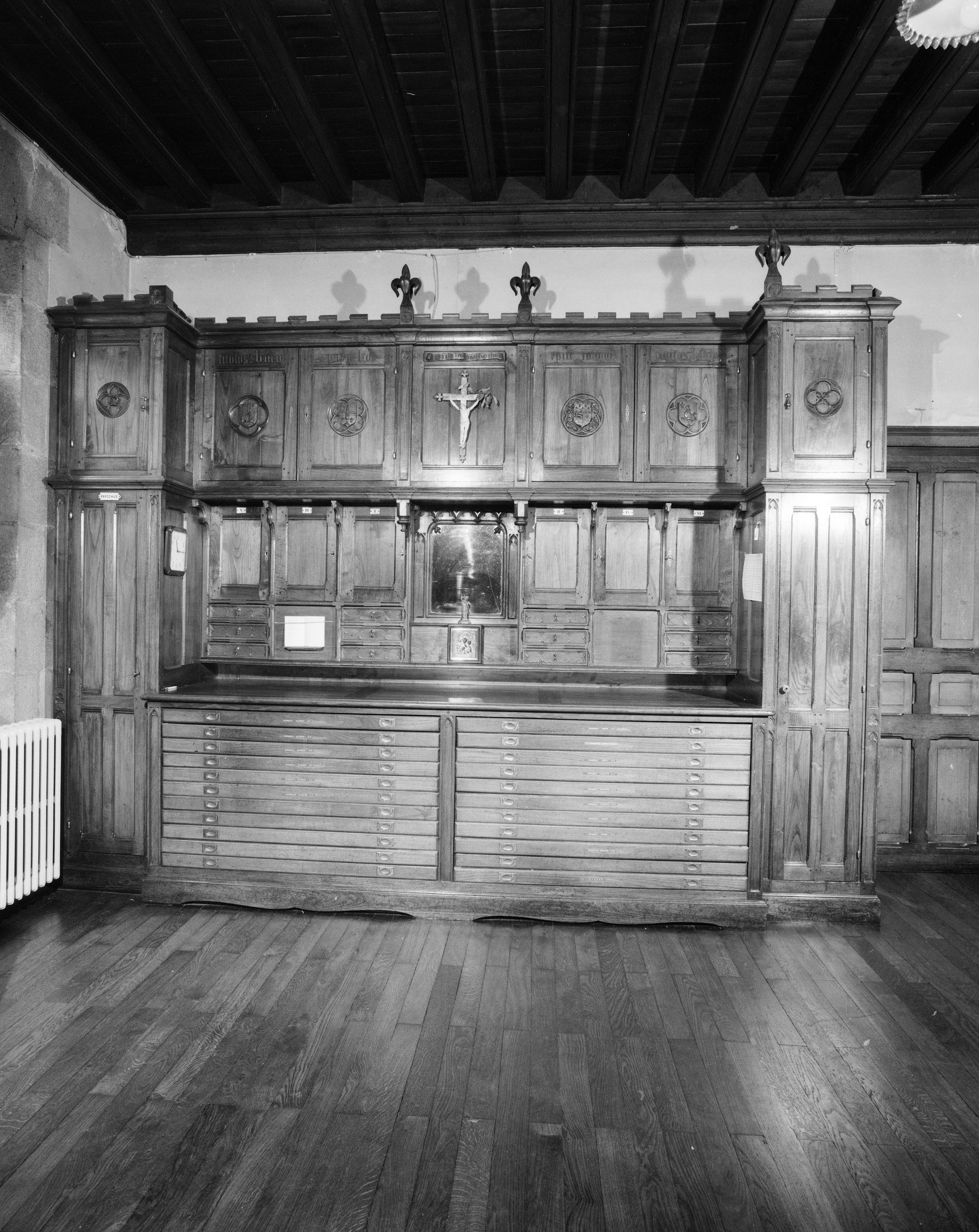 Ensemble de meubles de sacristie : 2 armoires, meuble de rangement pour objets liturgiques, tronc, bureau, armoire à archives, table, 2 placards, chasublier, basilique Notre-Dame-du-Roncier (Josselin),