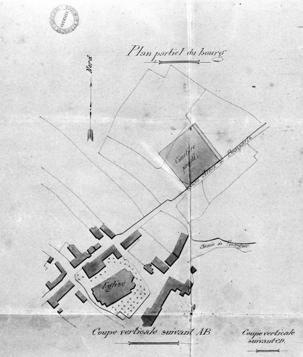 Plan partiel du bourg en vue du transfert du cimetière, par A. Gassis, 1881 (A. D. Finistère, 2 O 949)Immatriculation