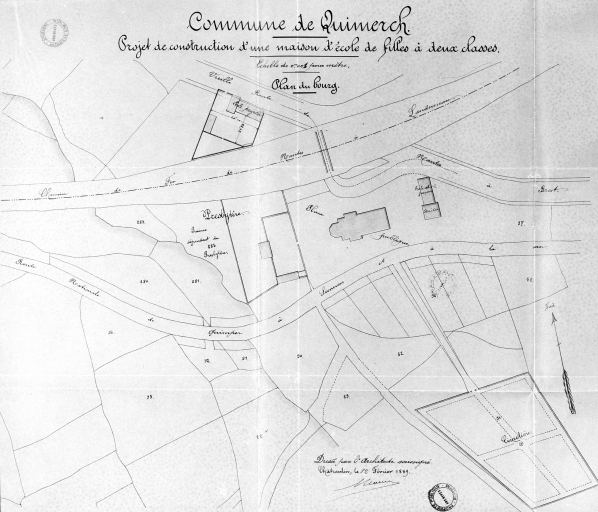 Plan du bourg et projet d'une école de filles (1889). Armand Gassis, architecte (A. D. Finistère, 2 O 1603-1606)Immatriculation