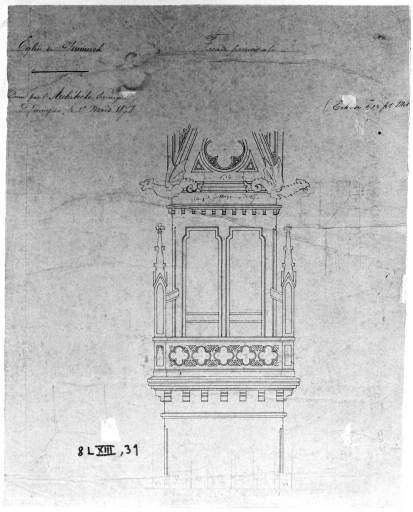 La flèche, détail d'une élévation. Dessin par Jules Boyer, architecte, 1878 (A. E. Quimper, fonds Bigot)Immatriculation