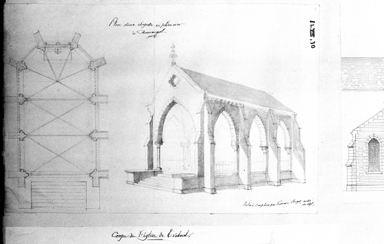 Plan et élévation de la chapelle de plein air. Projet de Gustave Bigot, 2e moitié 19e siècle (A. E. Quimper, 8 L XVIII 30)Immatriculation