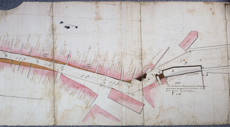 Plan dit plan de la traversée de la ville, par Le Roy, 1764. Partie sud de la Grande Rue et halles (A. D. Finistère, 1 J)Immatriculation