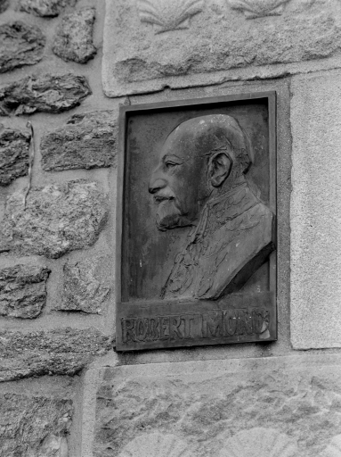 Détail extérieur près de la porte d'entrée, plaque avec portrait de Robert Mond.Immatriculation