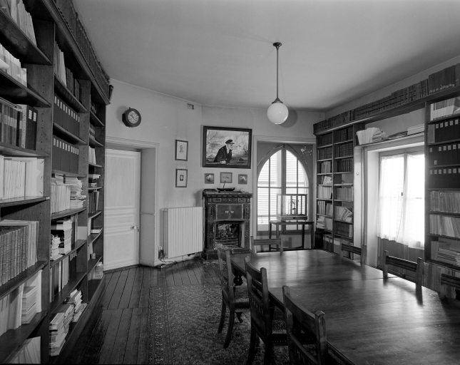 Vue générale de la bibliothèque actuelle, ancienne salle à manger, niveau R-1.Immatriculation