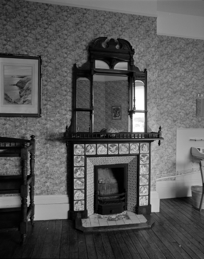 Vue générale de la cheminée, chambre 1, rez-de-chaussée..Immatriculation
