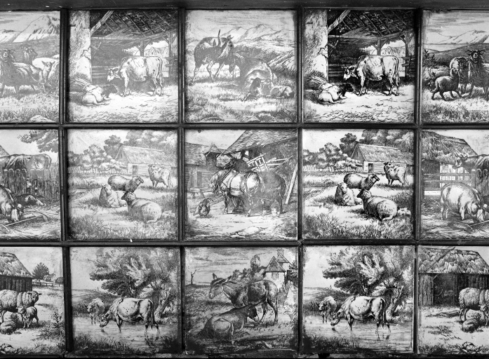Détail du décor d'une cheminée d'angle, chambre 7, niveau R+1.Immatriculation