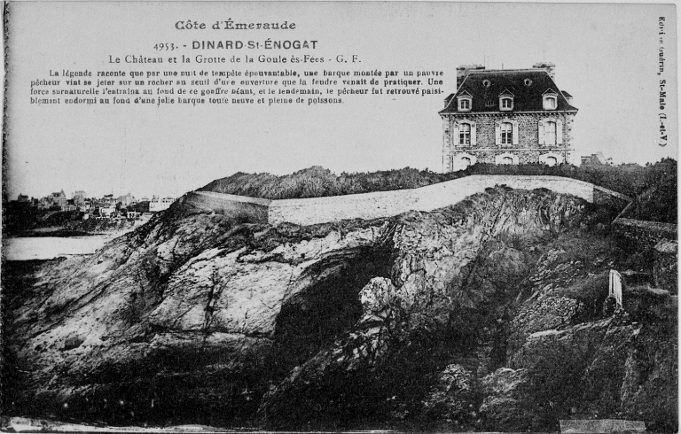 Carte postale ancienne. Dinard - St-Enogat Le château et la grotte de la Goule aux Fées. G.F. éditions Guérin, Saint-Malo (I.-et-V.).Immatriculation