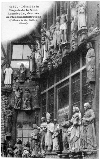 Carte postale ancienne. Collection du Dr Millard - 4187. Dinard - Détail de la façade de la villa Sunnisyde, décorée de vieux saints bretons.Immatriculation