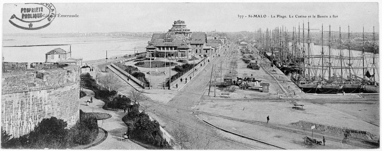 Carte postale panoramique début 20e siècle. Saint-Malo - La plage, le casino et le bassin à flot.Immatriculation