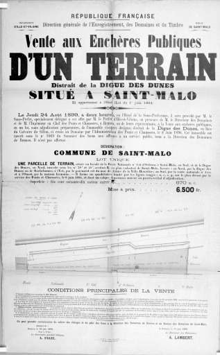 Affiche de vente aux enchères d'un terrain domanial sur la digue des Dunes, 1899.Immatriculation