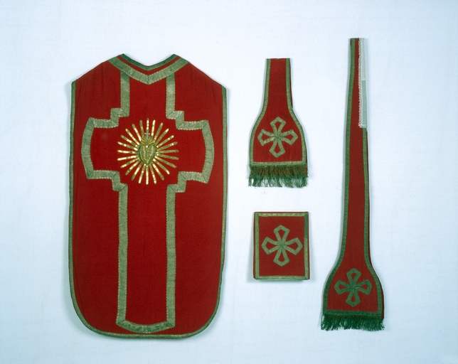 Chasuble, étole, bourse de corporal, manipule (ornement rouge), prieuré Notre-Dame-de-l'Assomption (prieuré cure), église paroissiale de bénédictins (Bréal-sous-Vitré),