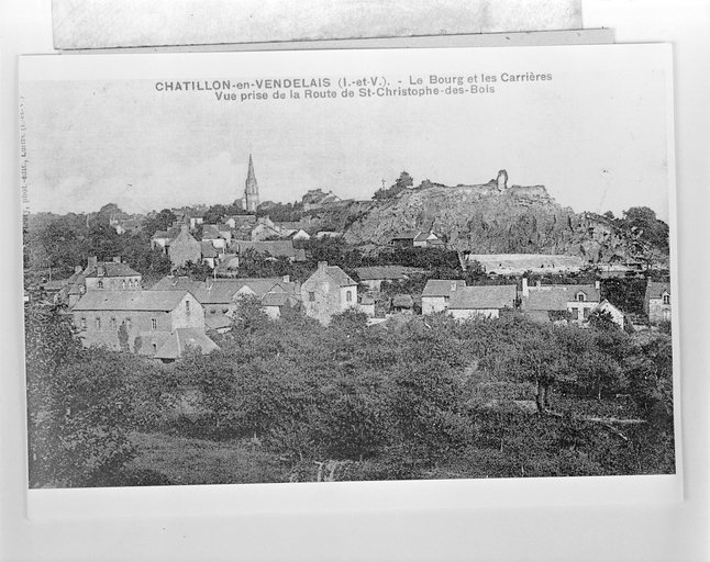 Carte postale ancienne - Le bourg et les carrières. Vue prise de la route de Saint-Christophe-des-Bois.Immatriculation