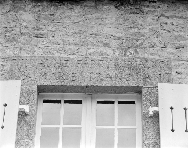 Elévation principale, détail de l'inscription sur la porte d'entrée.Immatriculation