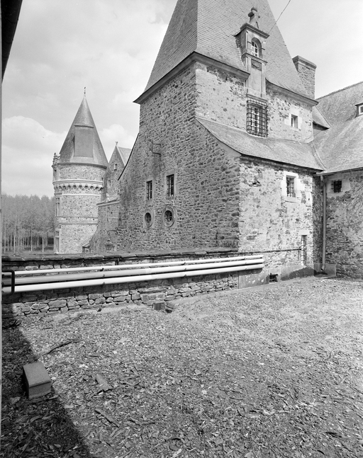 Vue ouest de la tour d'escalier et de la tourelle du château.Immatriculation