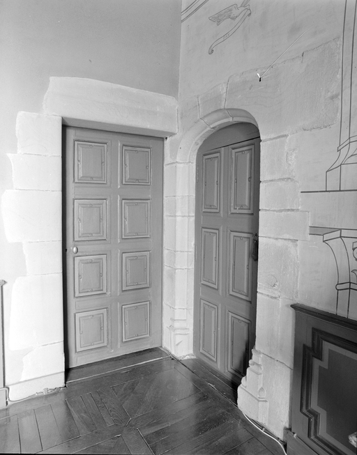 Salle à l'étage : vue générale des deux portes en angle.Immatriculation
